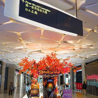 Shoppers are welcome with a giant spooky halloween tree greeted by witches, at SkyAvenue, Genting Highlands.